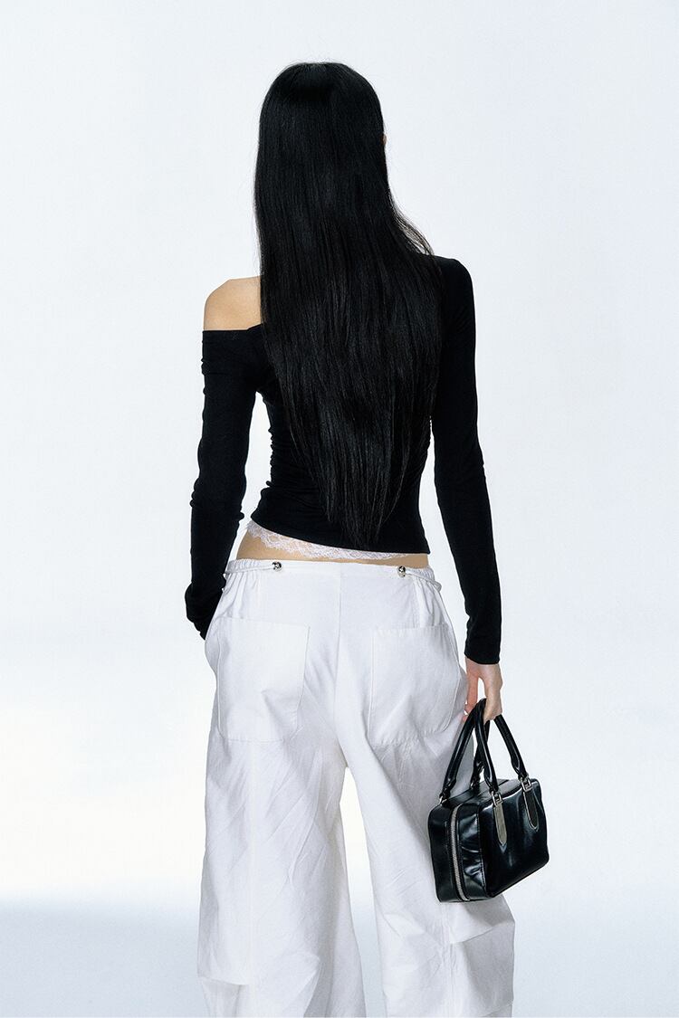 片方の肩を大胆に見せるアシンメトリーなデザインで、女性らしさとモード感を演出します。
