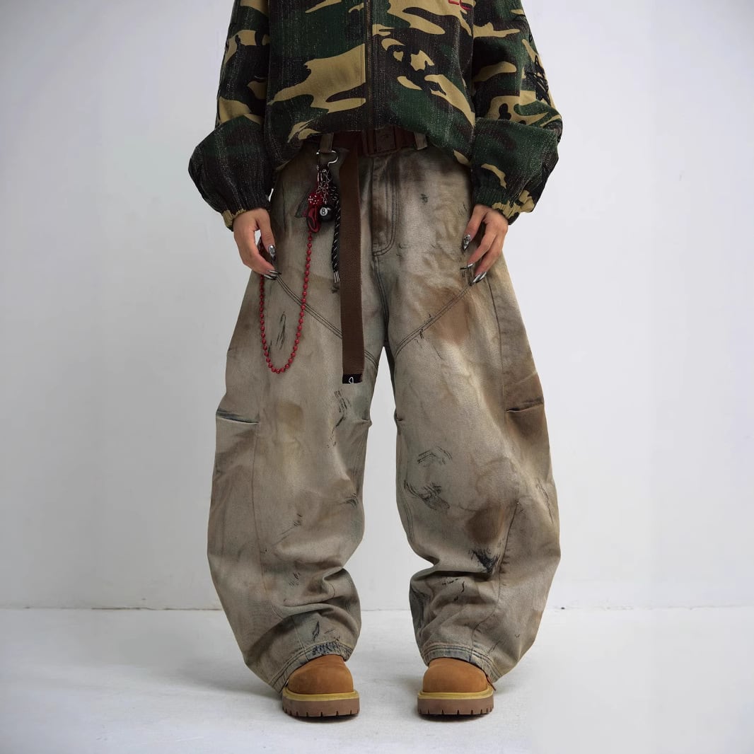ルーズなシルエットとボリューム感のある裾がストリート感を演出し、履くだけで存在感のあるスタイルを完成させます。ユーズドライクな色合いとランダムなアタリ感で、ヴィンテージさながらの雰囲気に。ミリタリーやストリート、モードなスタイリングまで幅広く合わせやすい一本です。